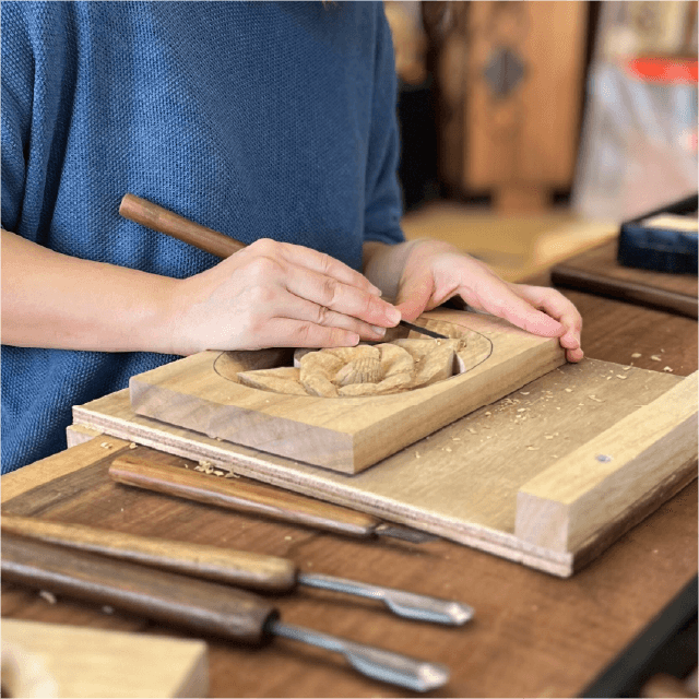 日本一の彫刻の技術を誇る伝統的工芸品”井波彫刻”は、荒彫りから仕上げ彫りまで200本以上のノミ、彫刻刀を駆使する高度な技術を持っています。